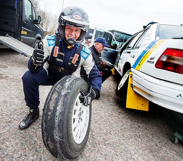 Tio bakdäck lyckades jag köra slut på, då måste man vara nöjd, förklarade en glatt leende Tom medan däckbytare Lars Servin gjorde sitt jobb..