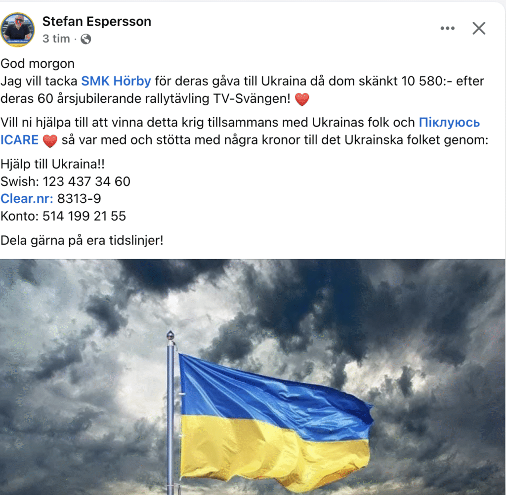 Avslutar med att man blir lite tjock i halsen när ”Hjälp till Ukraina” genom Stefan Espersson tackar offentligt för stödet från TV-Svängen och SMK Hörby. Ingen kan göra allt men alla kan göra något, passar väl bra i det här sammanhanget?
