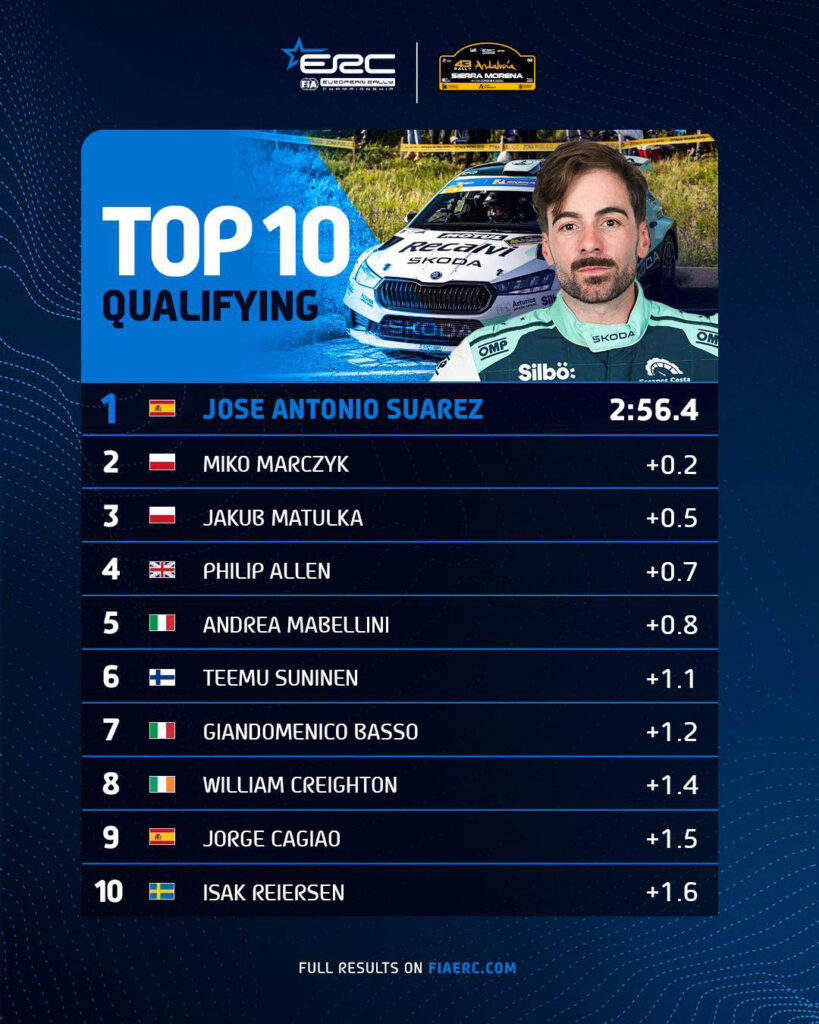 Mindre än en halv sekund skilde melon Topp-3 när det var kval till ERC-premiären ”Andalucía Rally – Sierra Morena – Córdoba World Heritage Site”. Längst upp finns hemmaföraren med Skoda José Antonio Suárez, 0,2 sekunder regerande mästaren, Mikolaj Marczyk med polske landsmannen Jakub Matulka efter sig.