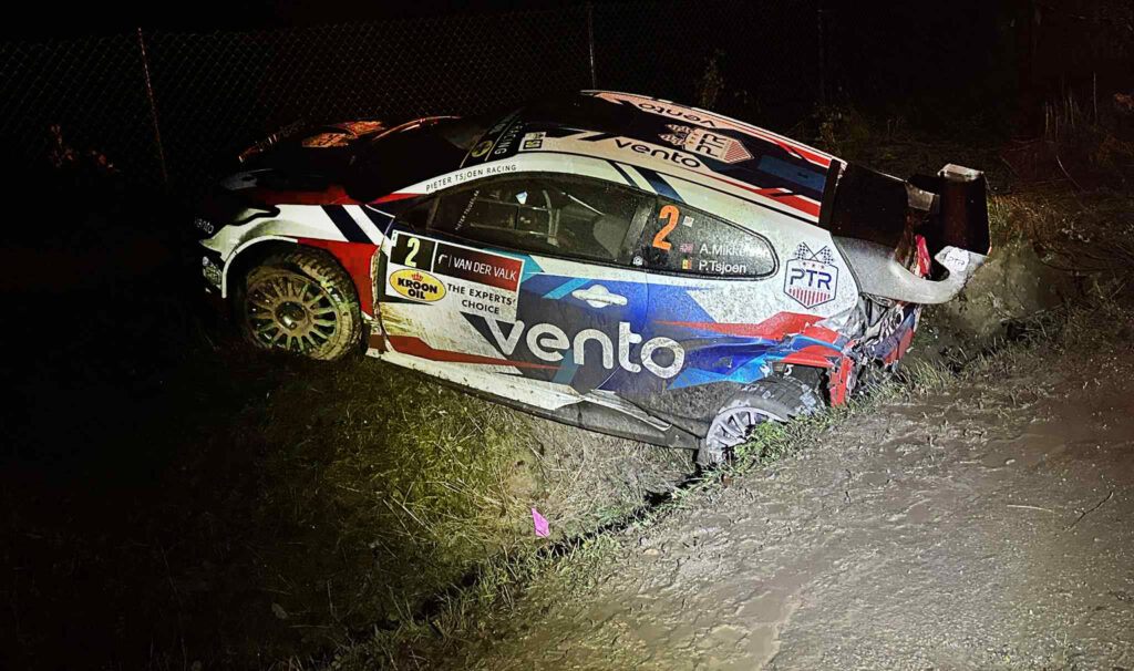 På den smala och regnhala sträckan gick Andreas alldeles för brett och hamnade i ett vattenfyllt dike. ”Game over” för Toyota-paret som nu blev publik där Tom Heinrich med Citroën leder efter fyra körda sträckor.