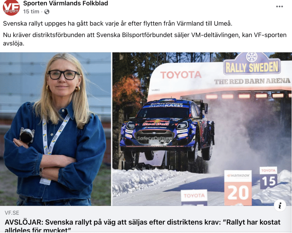 Tråkigt nog är artikeln låst och för en skåning tillhör en prenumeration på VF inte livets nödtorft. Men så mycket har snappats upp att det ska finns intresserade köpare för att ta över driften och att SBF ska genomföra kostnadsbesparingar under 2026. Att ”Rally Sweden” inte är och aldrig varit en kassako är välkänt, även om man ibland nåtts av information om motsatsen. Oavsett ”avslöjandet” så känns det inte optimalt med den här sortens uppgifter med tanke på att det bara är fyra månader kvar innan deltävling två i WRC 2026 ska starta…